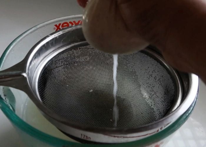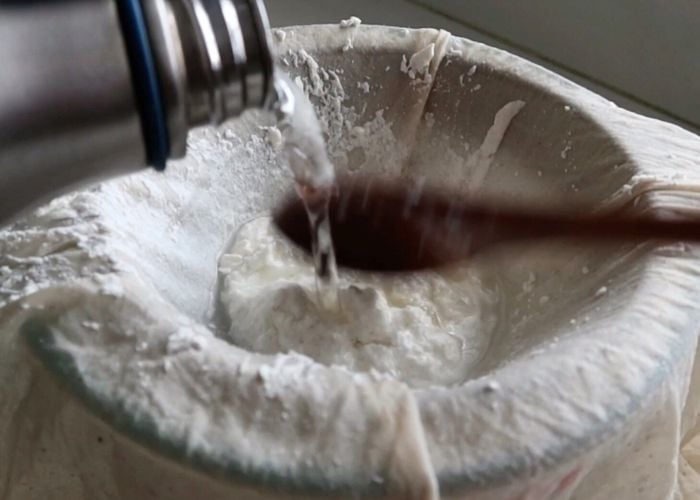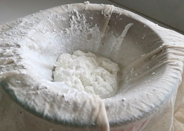 - At this point place a strainer over the top of a bowl . Spread cheese cloth on top of the sieve. Pour the milk mix over the cheese cloth. Strain the whey water from the mixture. Pour water over the curd and mix well so the excess sourness from the vinegar washes away in the cottage cheese.