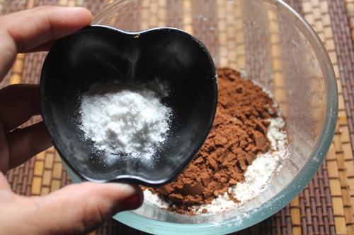 - Take flour, wheat flour, cocoa, baking soda, powdered sugar in a bowl and mix well.