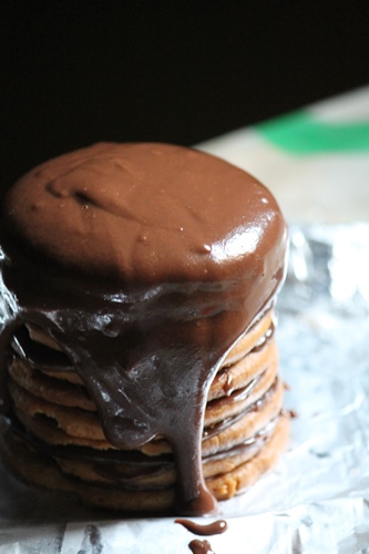 Icing : Dark chocolate and unsalted butter are melted to form a glossy, smooth and rich chocolate icing. Pour this over the biscuit tower and refrigerate for 30 minutes.