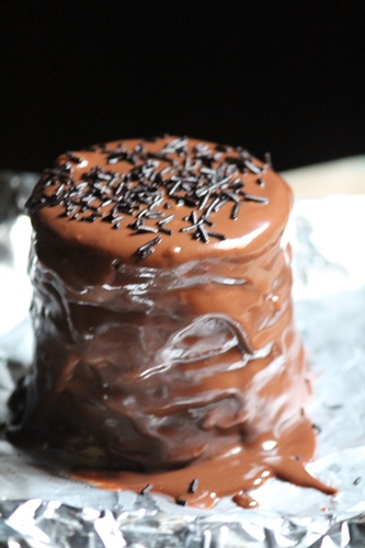 26)Pour the chocolate glaze on top and let it drip on the side.
