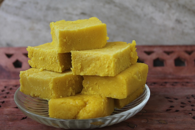 In my place, there is a sweet stall. They sell a burfi which taste so yummy. It is soft and just melt in your mouth. Yesterday me and my mom were having an argument, she told me that those burfis are made with gram flour, but i told her that no not at all, they are made with maida. This argument got very serious and i told her that i will make you that burfi right now, lets taste and decided. Immediately i got into action and made it, and when she tasted it she accepted that it is made with maida.