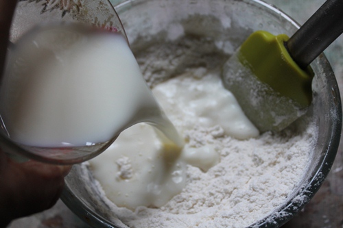 - Take flour, baking powder, sugar, milk in a bowl and mix well to a smooth batter.