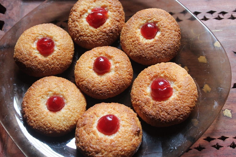 - Now take small portions of it and roll it into a ball. Flatten it and place a cherry half in the center and press it gently.