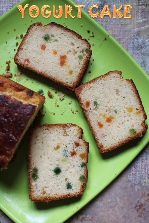 French Yogurt Cake Recipe with step by step pictures. This is a perfectly baked spongy vanilla cake with tutti frutti that makes so colorful & attractive.