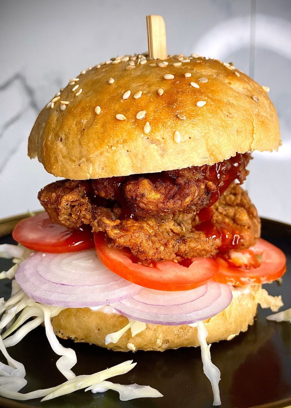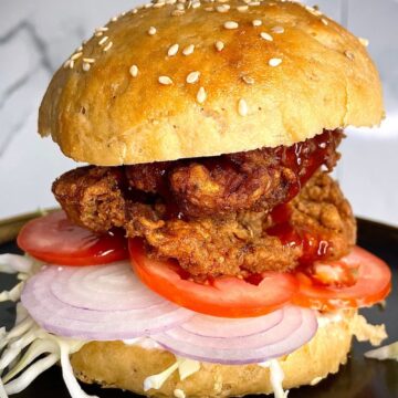 Delicious and juicy fried chicken burger which is not only tasty but is super easy to make. This burger makes a great lunch or dinner. Super delicious spicy burger which is perfect to pack in lunch box or taste amazing for dinner too.