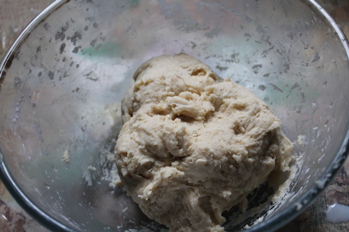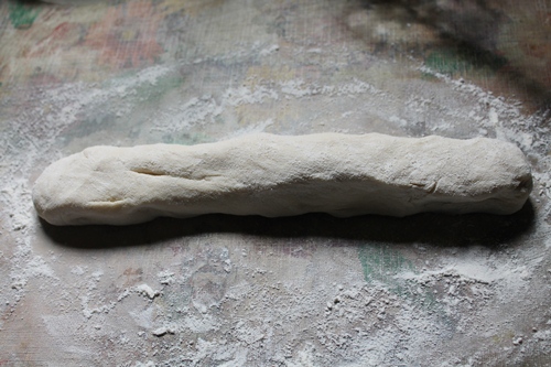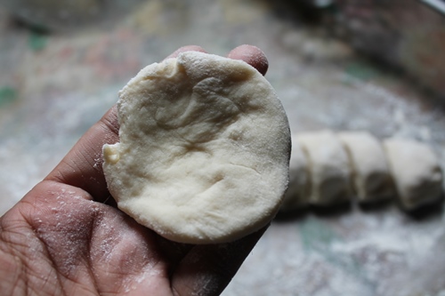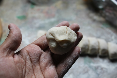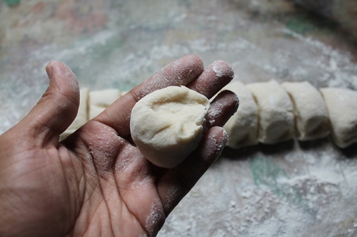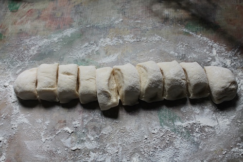 - Now take the dough. Punch back the air from the dough and knead one more time. Take a small portion from dough, roll it into a log and cut into pieces.