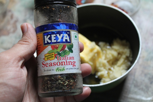 - Now in the remaining butter, add oregano, salt and garlic and mix well. Set aside.