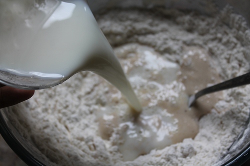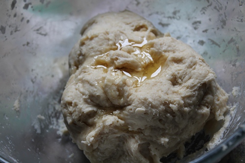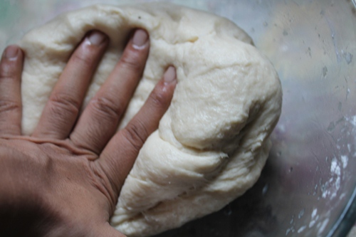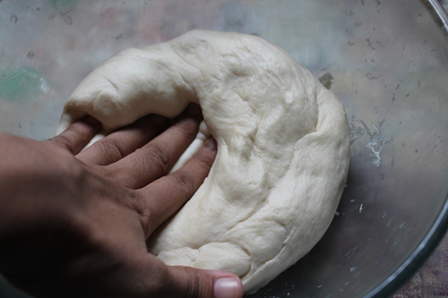 - Now take flour, salt, olive oil in a large bowl. Mix well. Pour the yeast mix and remaining milk and knead it to a soft dough. Add 1 tblspn of oil and knead to a soft dough for 10 mins till it is soft and smooth.
