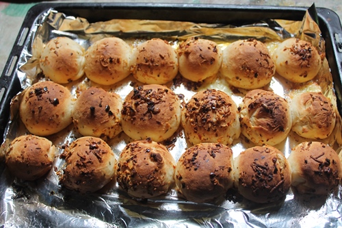 - Take one portion, flatten it, place a cheese cube and close it. Arrange it in the baking pan. Cover and let it rise for 30 mins.