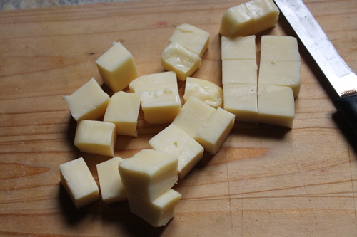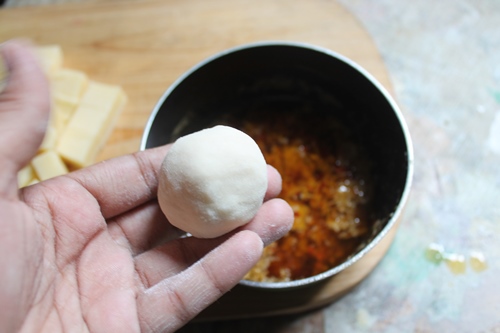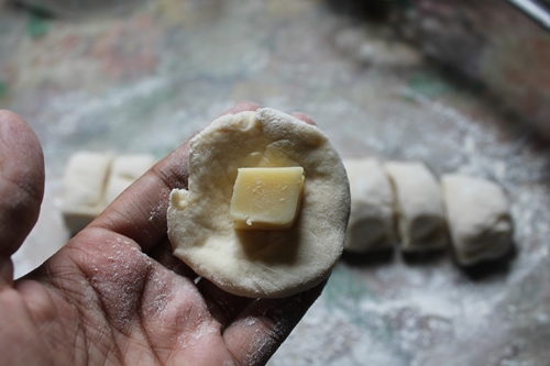 - Now take a ball and flatten it lightly, place a cube of cheese in the center and cover it well. Roll it into a smooth ball.