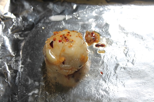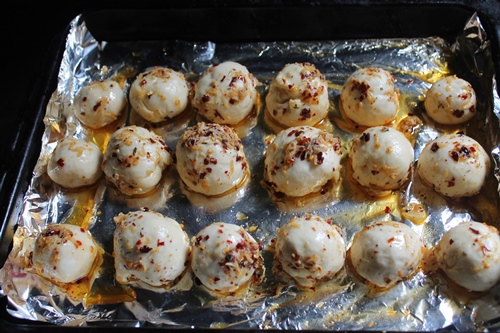 - Now take the balls and dip it in the garlic butter and place it in the tray.