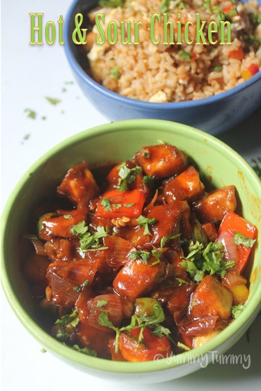 Chicken in hot and sour sauce is a lip smacking finger licking delicious chicken dish. It taste spicy as well as little sour, hence the name. This taste great with noodles or fried rice. I served it with my chicken fried rice.