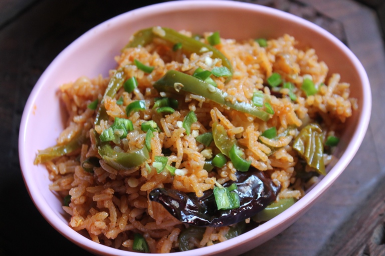 This is one quick fried rice you can make with garlic and chillies. It is a bit fiery but taste so delicious. You can serve it as it is or as a side for any gravy.
