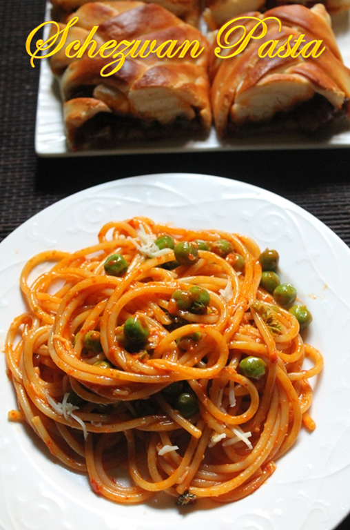 Schezwan Pasta recipe with step by step pictures. Spicy and addictive hot schezwan pasta with peas which taste delicious.