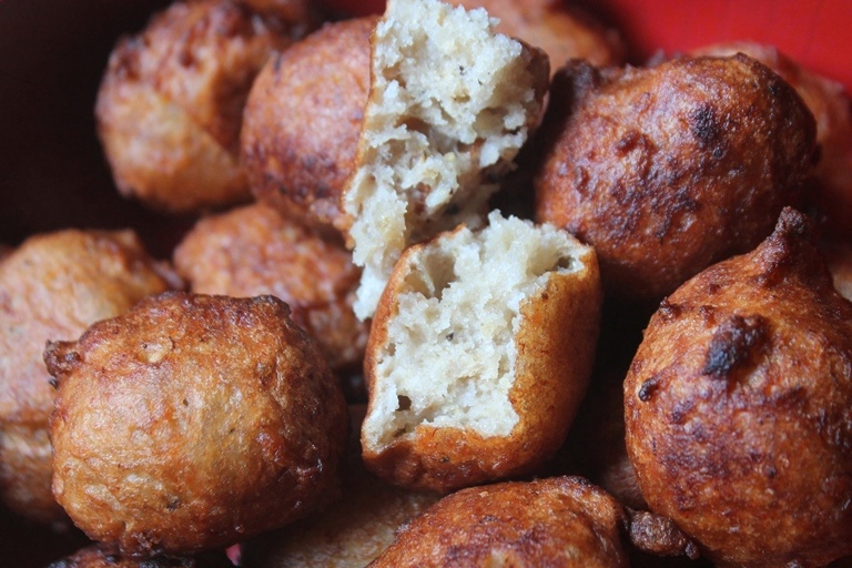 - Heat oil for deep frying, drop small spoonful of batter in and fry till golden brown.