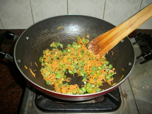 - Now heat oil in a pan and add in mustard and urad dal..Add in green chilli and ginger and mix well.Add in beans and carrot and cook for 5 mins.