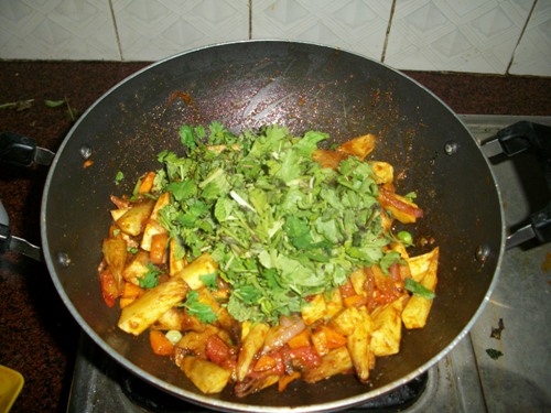 - Add in spice powders and mix well. Now throw in the fried jackfruit pieces and mix well.