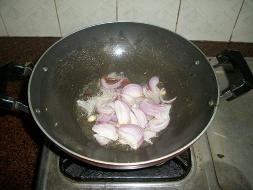 - Now heat oil in a kadai and add in cinnamon, cloves, cardamom. Fry this for 3 mins.