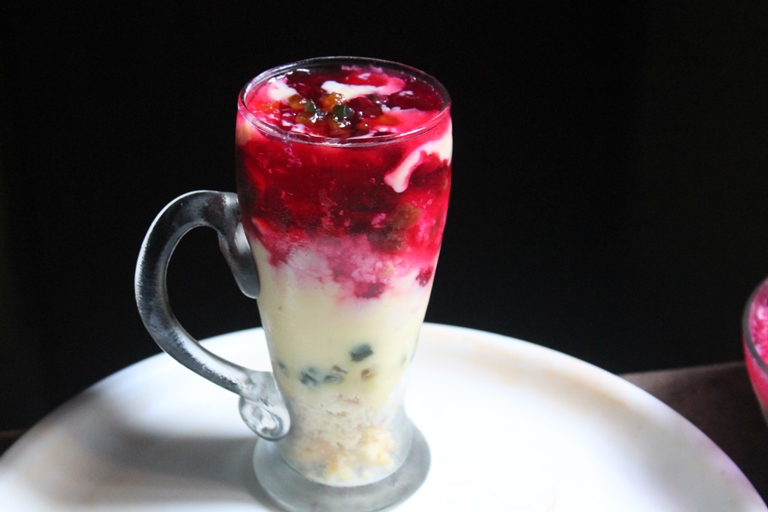 - Now take a serving glass, crumble some cake in, then top with little condensed milk and top custard, dried fruits and nuts, jelly and continue the process till it is layered.