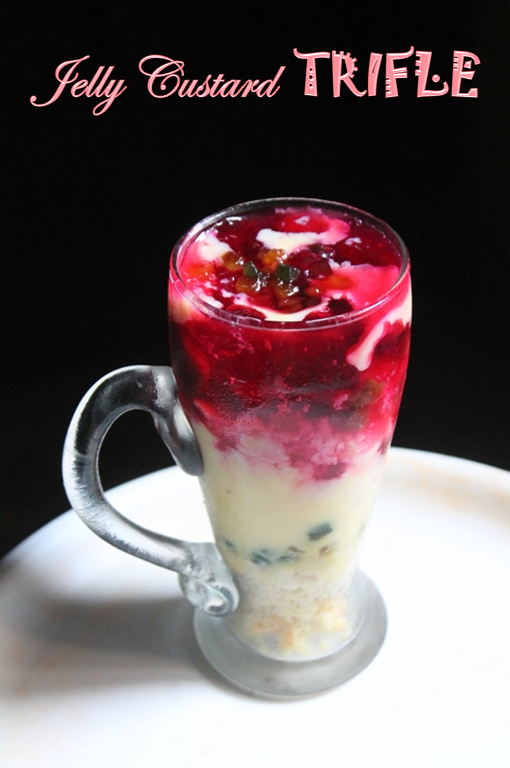 Jelly Custard Trifle with Step by Step Pictures. Delicious trifle made with a layer of sponge cake, custard, fruits and jelly.