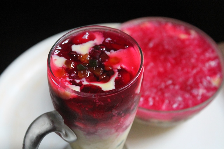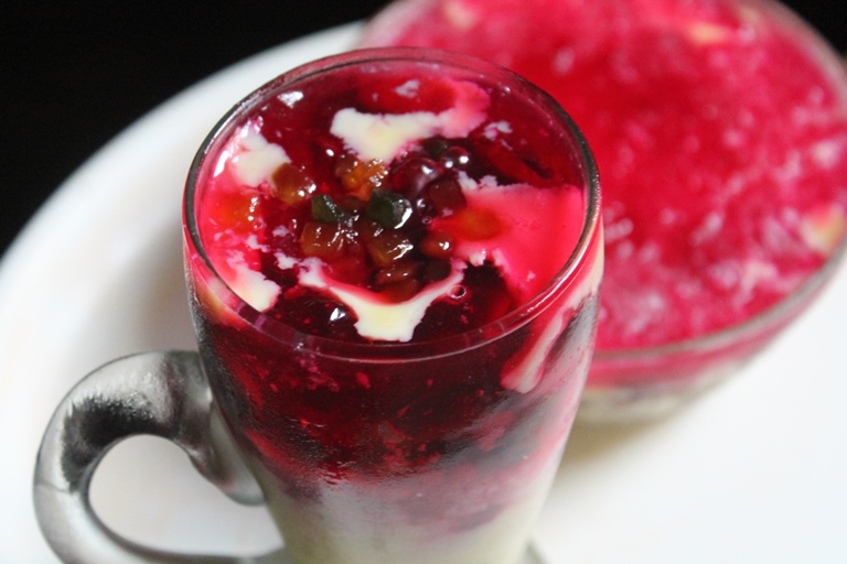 I made this with just custard and jelly and layered it with cake and dried fruits..You can use any fruits as you like. Mangoes, Strawberries, Apples, Pineapples will be great too.