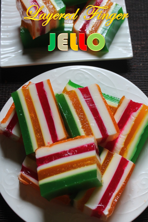 Layered Finger Jello Recipe with step by step pictures. This recipe is the perfect finger food for parties which is easy and can be done using many color combinations.