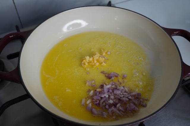 3)Add in finely chopped garlic and chopped shallots. Make sure to chop them finely. if you don't have shallots, you can use onions or white part of the green onions. Saute the garlic and onions for a minute until fragrant.