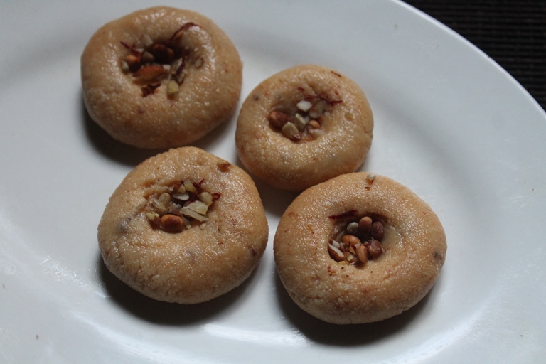 - Take small portion and shape it into a round ball. now shape it like a peda and top with some nuts.