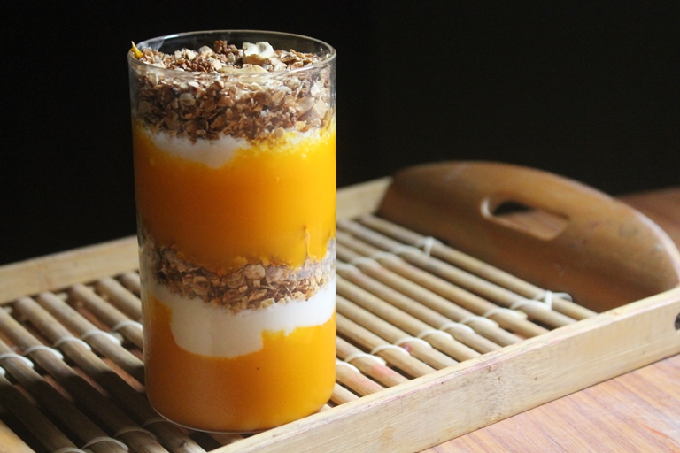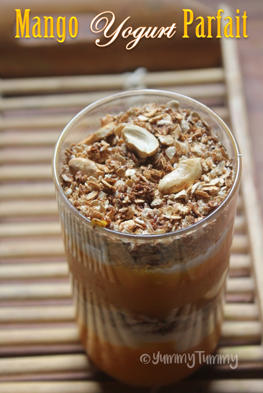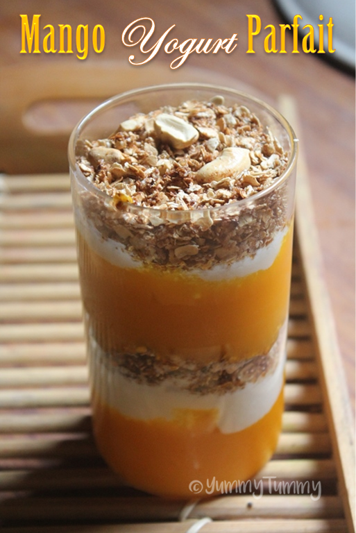 mango yogurt parfait is a healthy and colourful layered breakfast recipe. The mangoes, yogurt and granola makes a perfect breakfast.