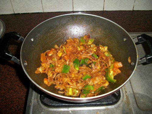 - Now add in tomatoes, capsicum and mix well.Cook till it turns mushy.