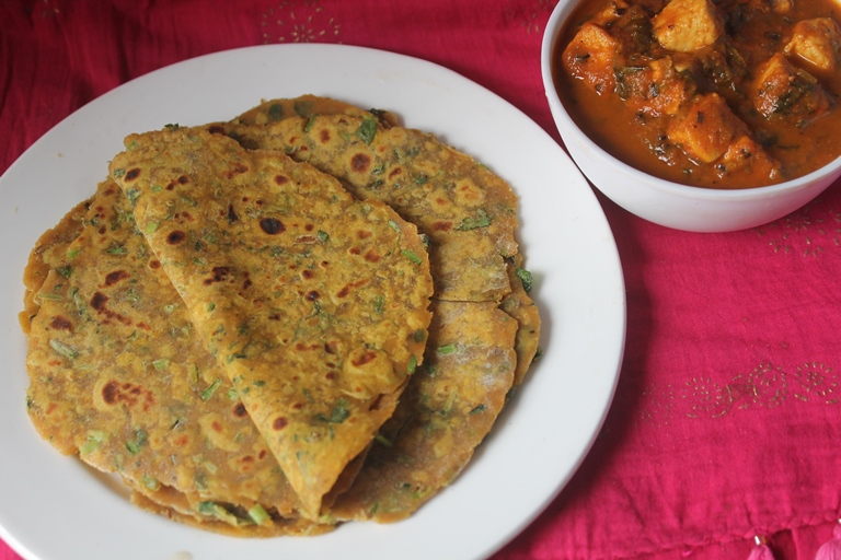 This delicious thepla is made using fresh methi leaves which taste fresh and delicious. All you need is some wheat flour, gram flour, fresh methi leaves and few spices.