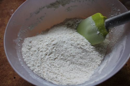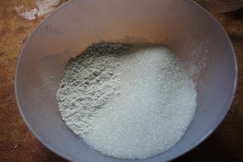 1)Take plain flour, sugar in a bowl.