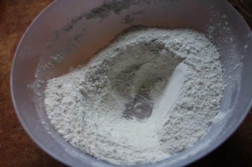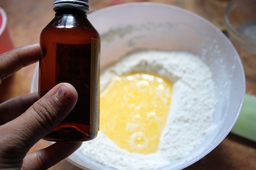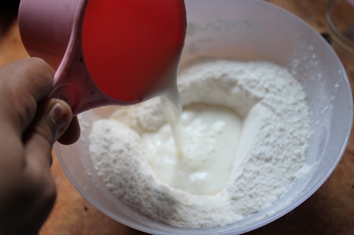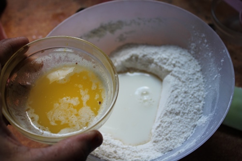 - Make a well in the center of the bowl, pour in milk, melted butter and vanilla in it. Fold to mix.