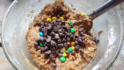 Monster Cookies Recipe with step by step pictures. This is made with Flour, Instant Oats, chocolate chip and M&M's. One cookie which has tons of ingredients called as monster cookies.