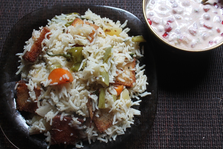 This recipe is from vahrehvah.com and it is simply delicious. The fried bread add a nice taste and texture to it and it taste amazing. Hubby loves fried bread in pulav or biryani, so i added a generous amount of it.