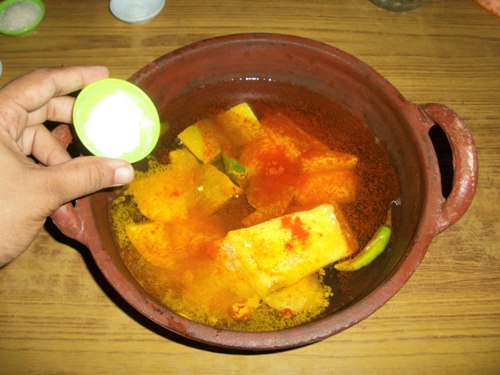 - Add chopped mangoes along with the seed in a kadai. Pour in 3 cups of water. Add in turmeric powder, chilli powder, green chillies, salt and sugar in it. Bring this to boil. Cook for 10 mins or until the mangoes are cooked.