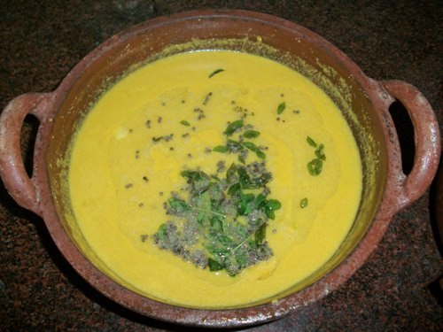- Now make tempering heating oil and add in mustard seeds and curry leaves. Pour this over the gravy and mix well. Serve hot with rice.