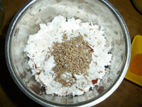 - Grind Coconut with cumin seeds to a smooth paste by adding some water.