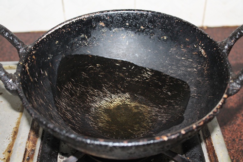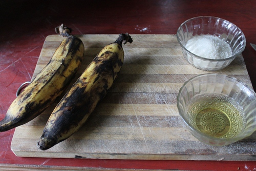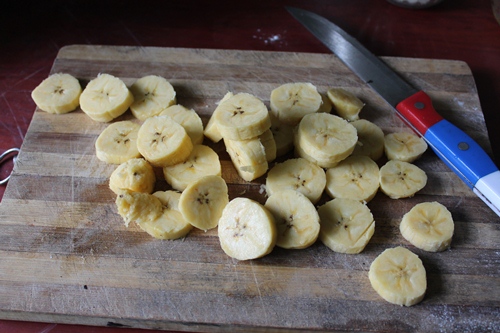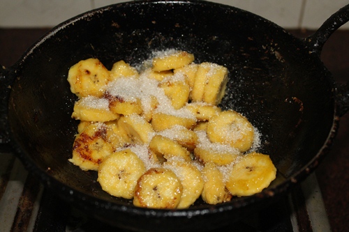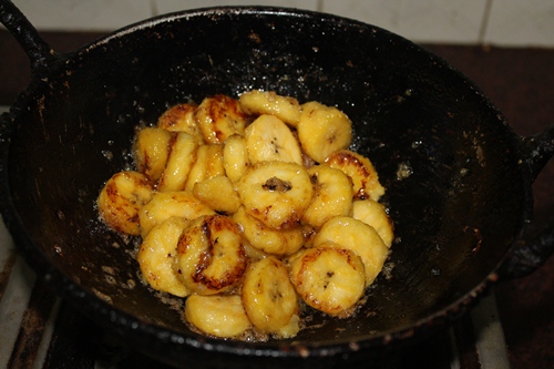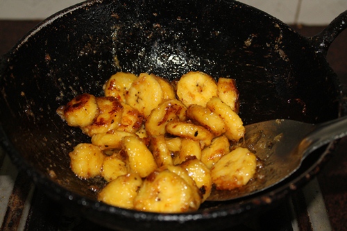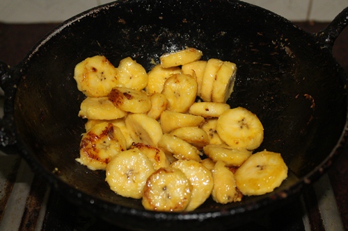 - Heat ghee in a kadai. Add the bananas in ghee and toss well.
