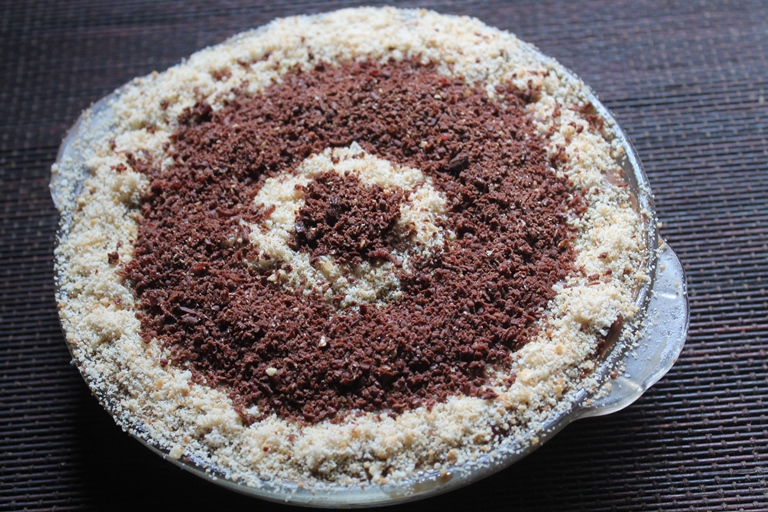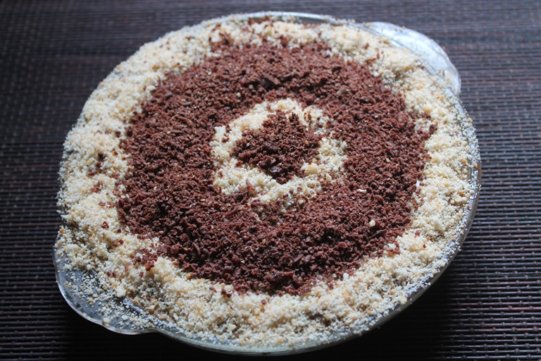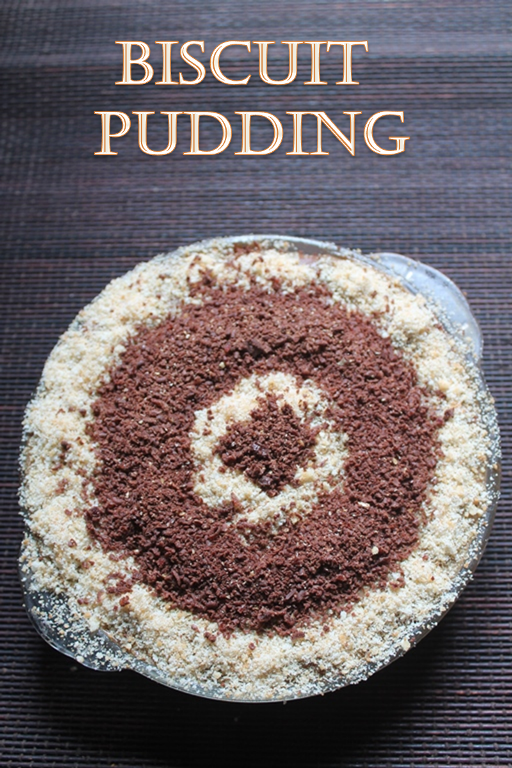 - Now for decorating, take some biscuits in a blender and powder it finely. Grate some chocolate, Now use these to decorate the pudding.