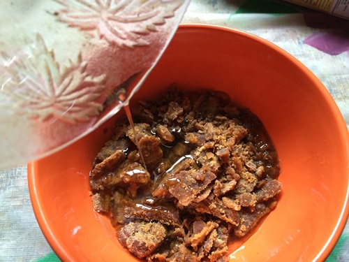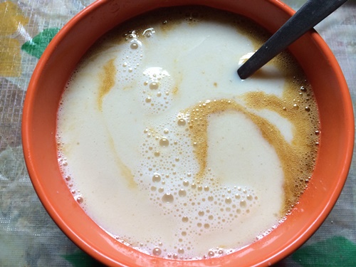 - Take egg, jaggery, vanilla, milk and oil in a bowl and mix till sugar is melted.