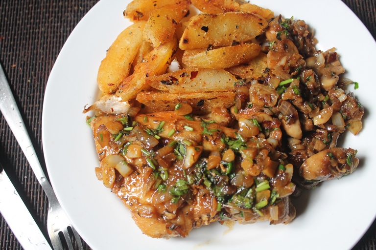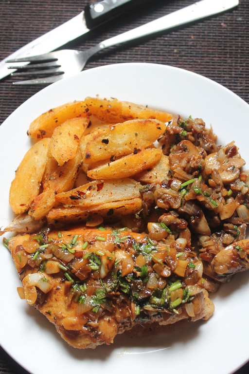 This plate has the best combo in food history..It has chicken, potatoes and mushrooms..I made a simple roast potatoes on pan and a butter sauted mushrooms which was too good to resist. But as the main the chicken was too good. It is moist and succulent. Check out chicken piccata recipe too.