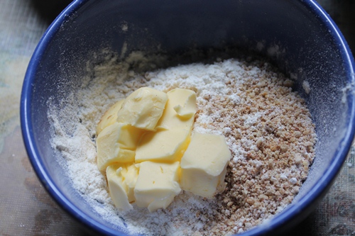 - Mix all the ingredients together for the streusel topping using a fork till it resembles coarse crumbles. Set aside in fridge till use.