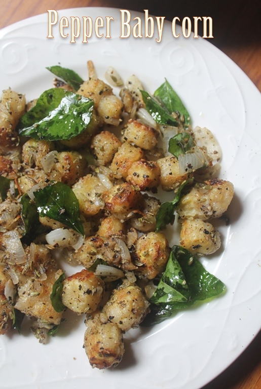 Baby Corn Pepper Fry Recipe with step by step pictures. Pepper Baby Corn is a quick and spicy appetizer made using baby corn which is tossed with crushed black pepper in the end.