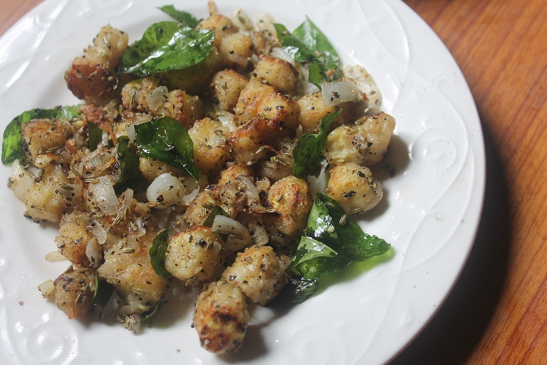 - Now heat little oil in a pan, add in ginger, garlic, curry leaves and onion and saute for a min.