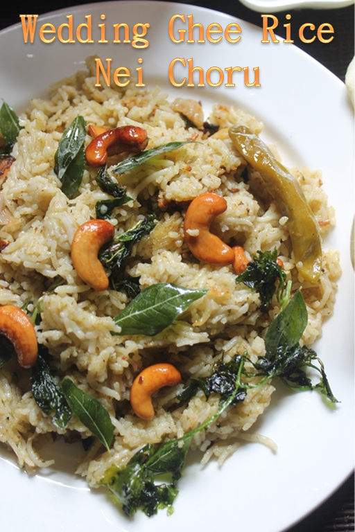 Ghee Rice is a popular dish made with either basmati rice or seera samba rice. The rice is flavoured with ghee, coriander leaves, mint leaves and fried onion. This dish is also called as nei choru and is very popular all over south indian specially in muslim community and weddings.