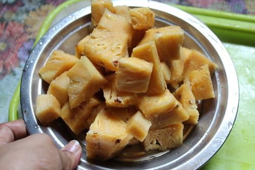 - Take pineapple, sugar in a blender and puree till smooth. Pass it through a strainer. Now add more water and mix well.