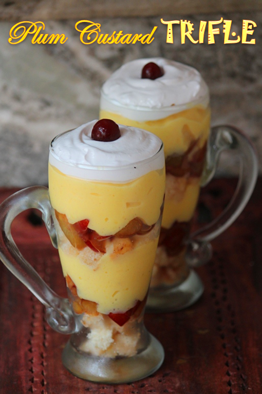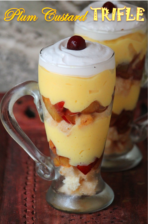 Plum Custard Trifle Recipe with step by step pictures. A trifle is a layered dessert, by layers of cake, fruit, custard and cream.