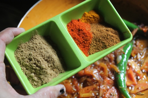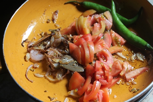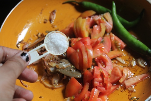 - Add in tomatoes and chillies. Saute till mushy.Add in salt and mix well.