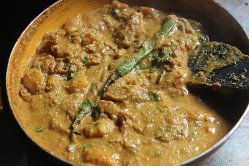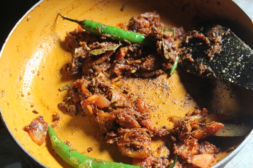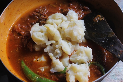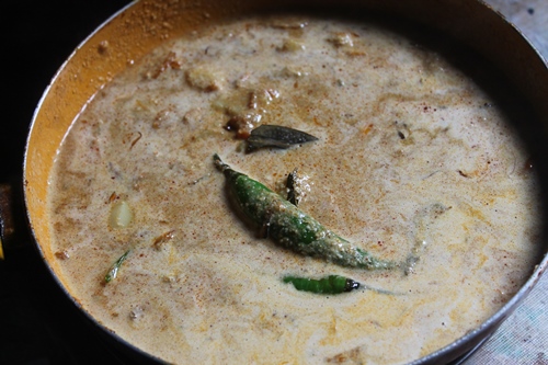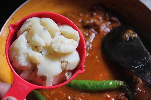 - Pour water and bring it to boil. Add in potatoes and coconut masala and mix well.